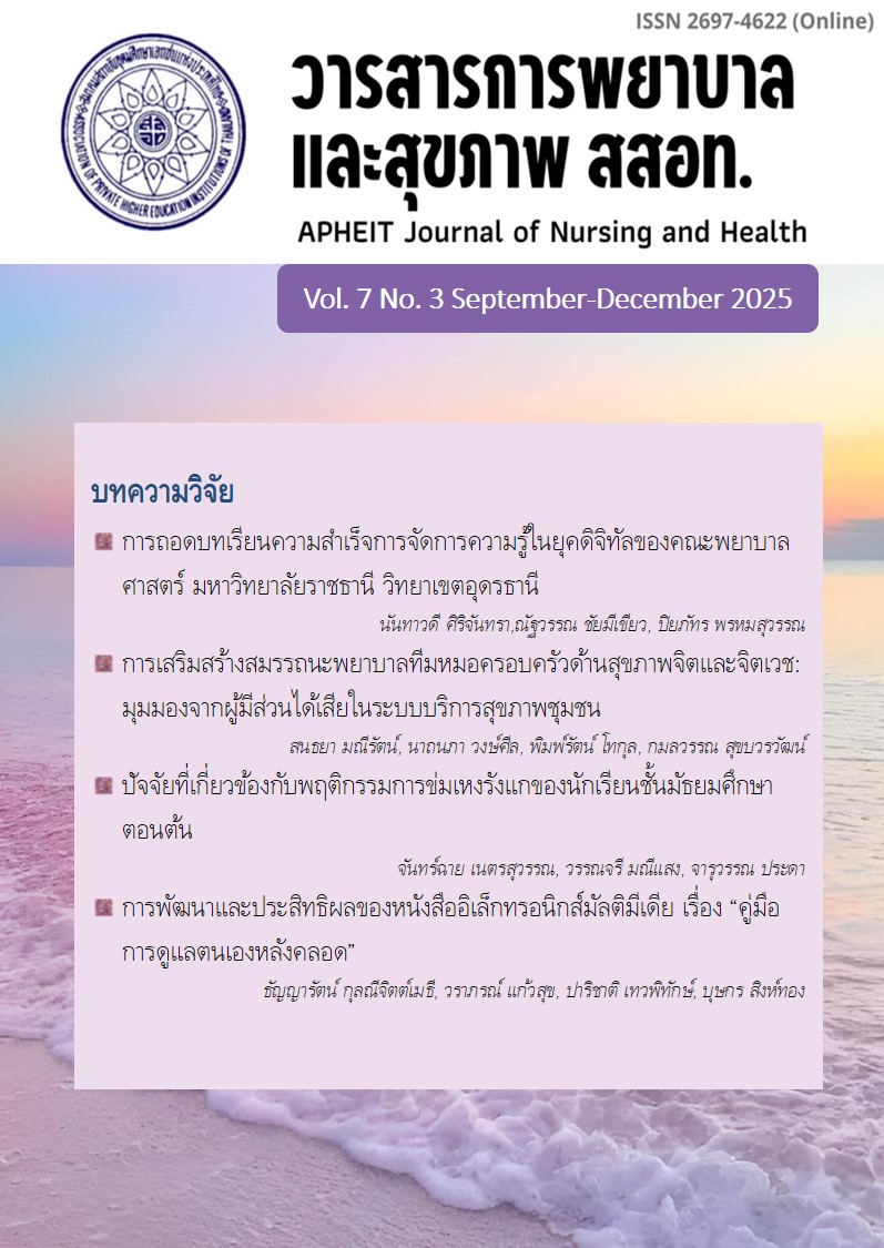 The finding revealed that the multimedia e- book entitled “Postpartum Self-Care guidebook” consisted of eight chapters and demonstrated an efficiency of 85.67/84.89, exceeding the established criteria of 80/80. Knowledge scores after learning through the multimedia e-book were significantly higher than those befor learning (p< .001). Overall satisfaction with the multimedia e-book (M = 4.45, S.D. = 0.26) and all subscales were at the highest level, with the design and presentation domain achieving the highest mean score (M = 4.60, SD = 0.37). The findings suggest that the multimedia e-book is effective in enhancing knowledge and can be utilized as a supplementary educational medium for providing health education to primiparous postpartum mothers.